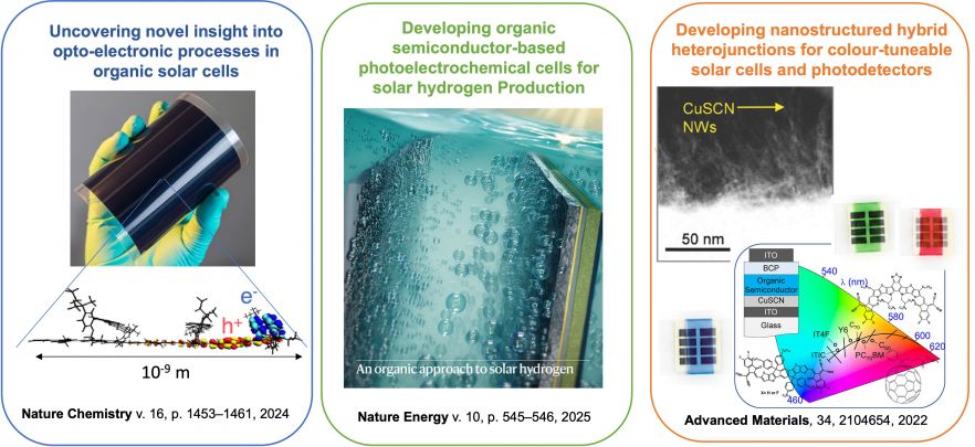 My research is on developing next-generation semiconductor devices for sustainable solar energy conversion and storage, such as photovoltaic (for sustainable electricity generation) and photoelectrochemical (for sustainable fuels) cells. I am interesting in semiconductors beyond silicon that are less energy intensive to produce and that have more tunable electrical, optical and photochemical properties. The group's main focus is on organic semiconductors, which can be synthesised from renewable feedstocks and can be processed into devices using low-temperature and non-toxic fabrication processes. Additionally, the optical and electrical properties of these organic semiconductors can be freely tuned in the synthesis process, which makes them ideal for tailoring to specific applications, such as for semi-transparent windows, indoor light harvesting, or catalysing specific chemical reactions for sustainable fuels synthesis.