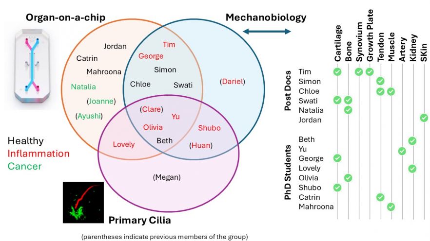Prof Knight has a large multidisciplinary research group with expertise including biomedical engineering, mechanobiology, cell biology, and organ-on-a-chip technology. We work on applications related to a variety of diseases and tissues as shown below. The group includes multiple post docs and PhD students. We also have a strong track record of hosting research fellows funded via various routes including EU Marie Curie Fellowships, Versus Arthritis Fellowships, etc.
